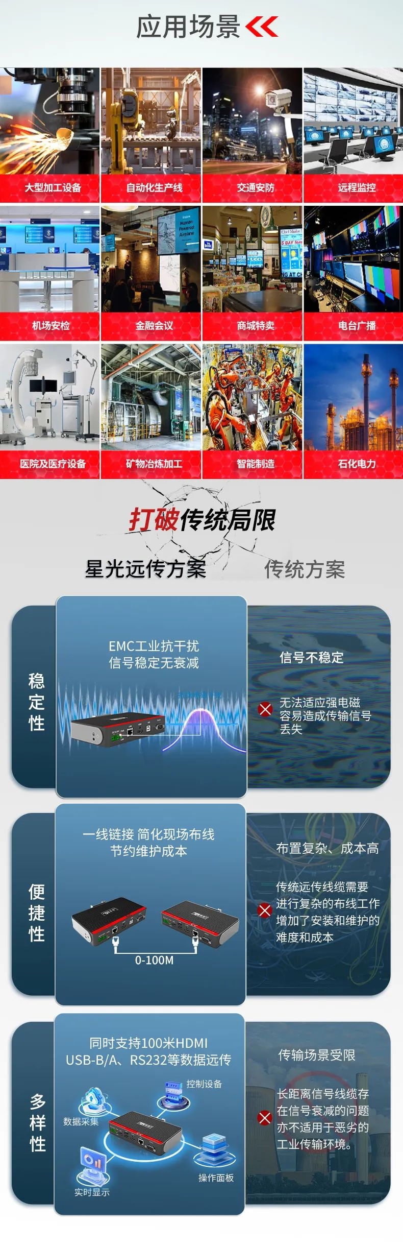 在大型裝備、自動化產線、激光及數控行業等需要遠距離信號傳輸場景中,傳統HDMI線纜存在信號衰減、傳輸距離限制、布線不便等問題,這極大地影響顯示端的成像質量和雙向數據的穩定性和時效性。為此,特控研發出抗干擾性強、數據零延時、兼容性強的HDMI星光遠傳ECU-TR12。