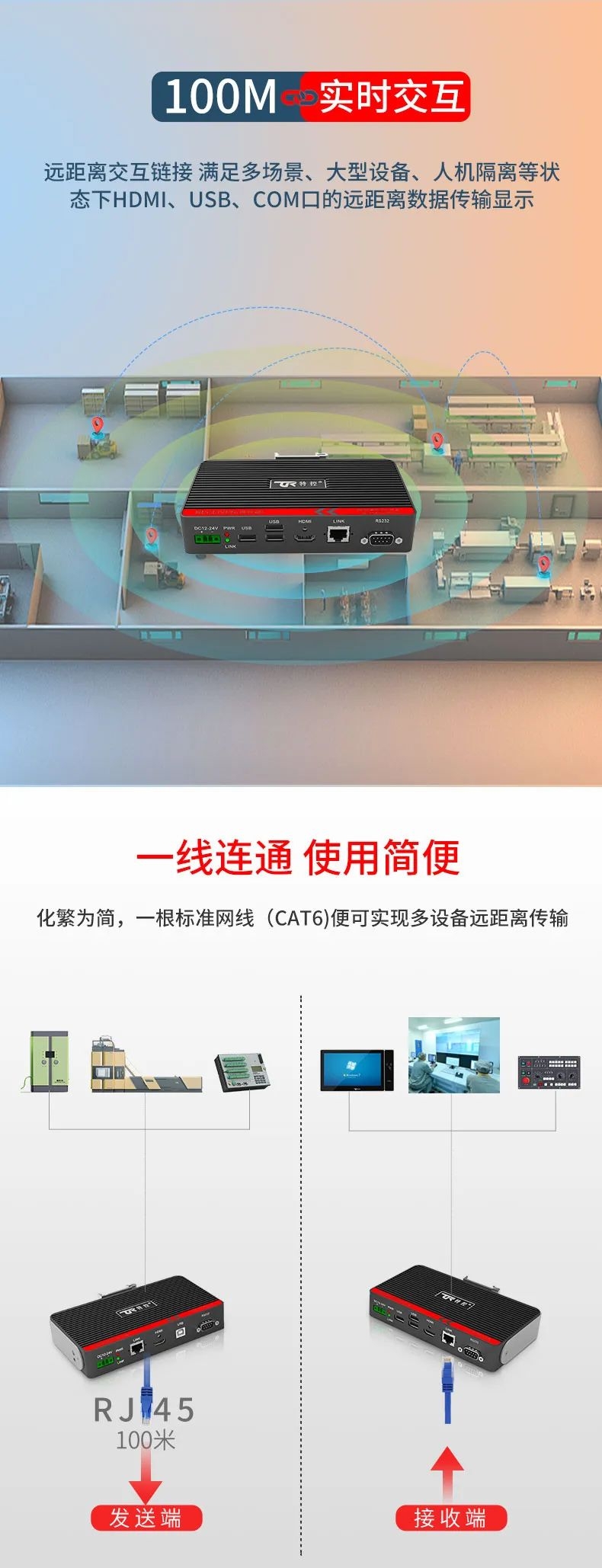 特控ECU-TR12采用進口高性能芯片設計,總體由發射端T12和接收端R12兩部分組成,發射端可將2.5k高清視頻信號、USB和RS232數據信號進行整合,通過標準網線(CAT6)遠距離傳輸到接收端,無信號衰減,接收端通過高性能智能芯片解碼,可以給用戶高速高質量的數據及顯示交互體驗,整機外殼采用鋁合金散熱設計,機身堅固小巧獨具工業美感,可搭配行業通用HDBeasT協議設備使用,包括內置協議的HMI操作端、工業顯示平板、工業PC及終端采集設備。